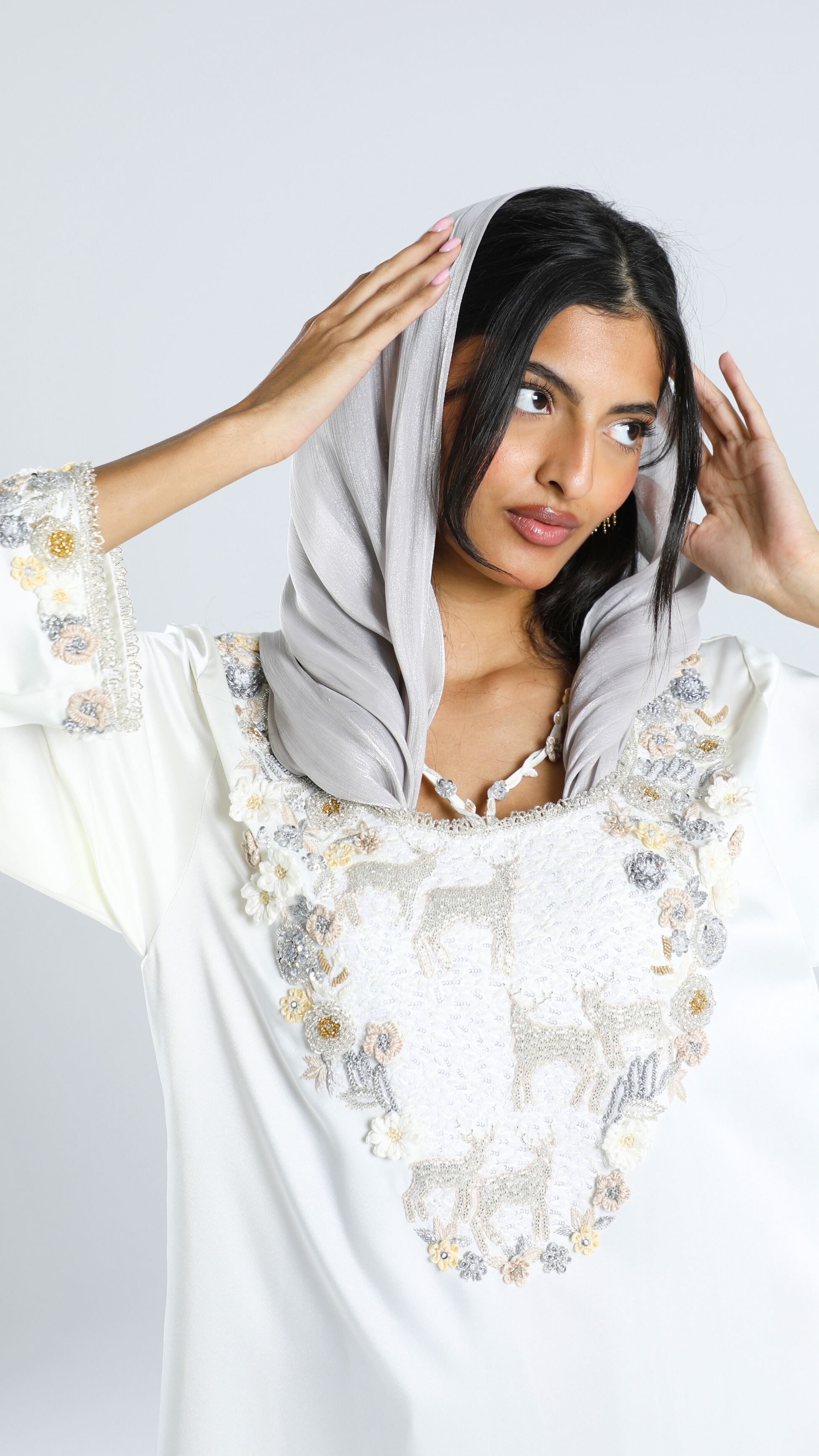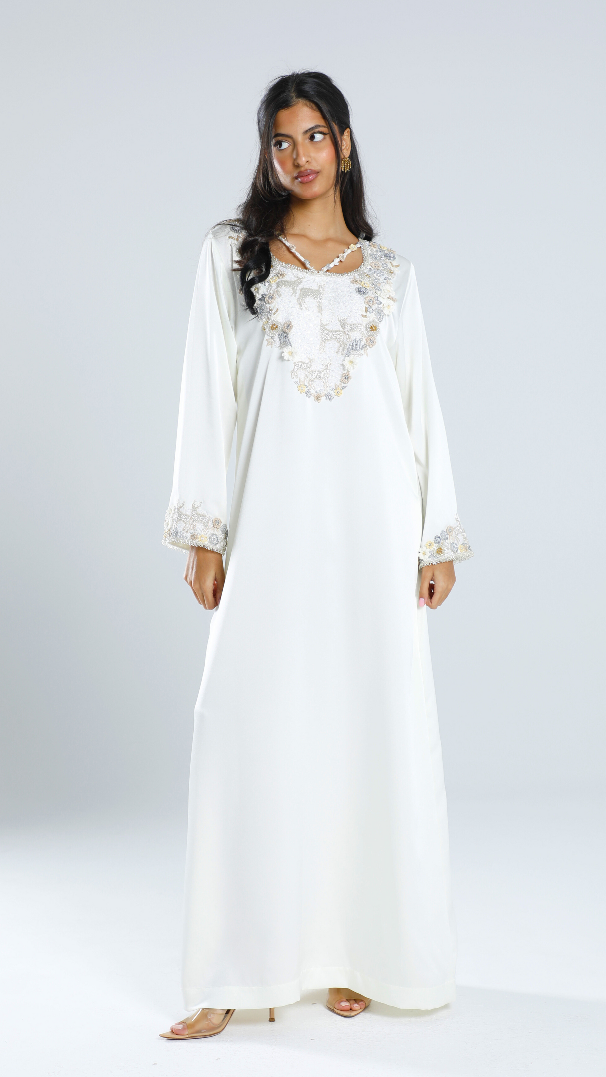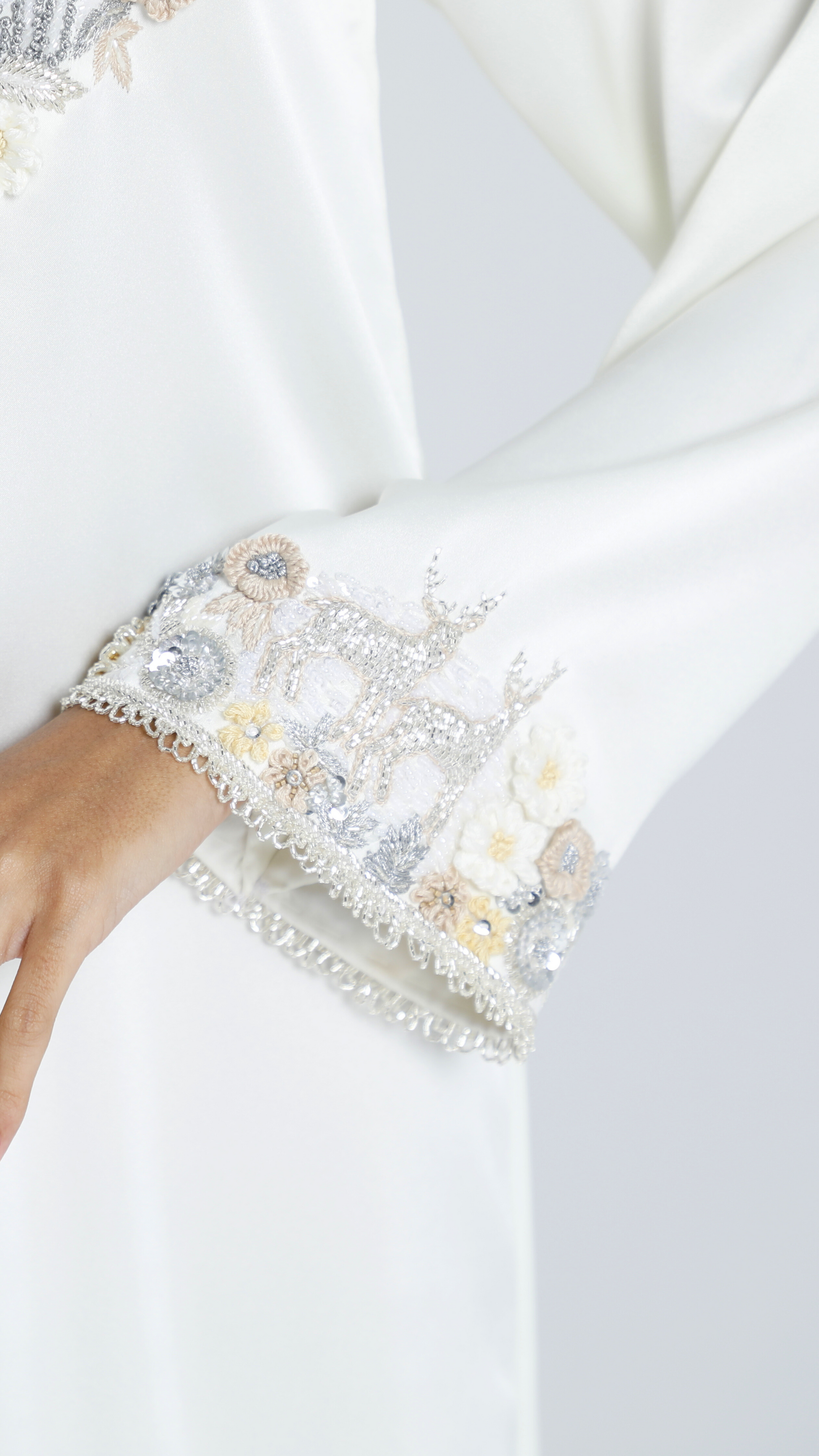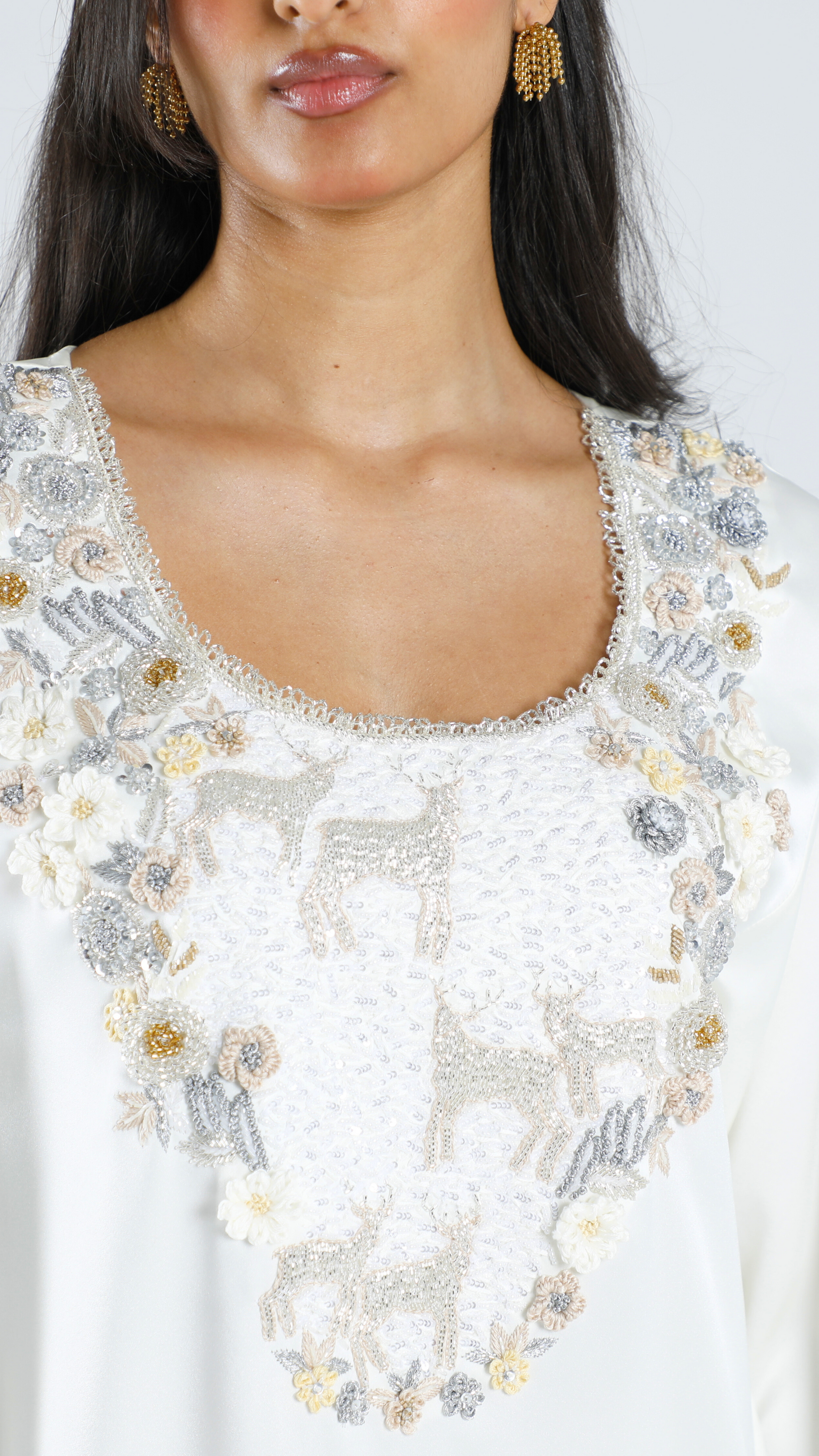 An enchanted field with magical deer, surrounded by intricately embroidered handmade flowers. The dress features a whimsical loop tasseled neckline, adding a unique touch.