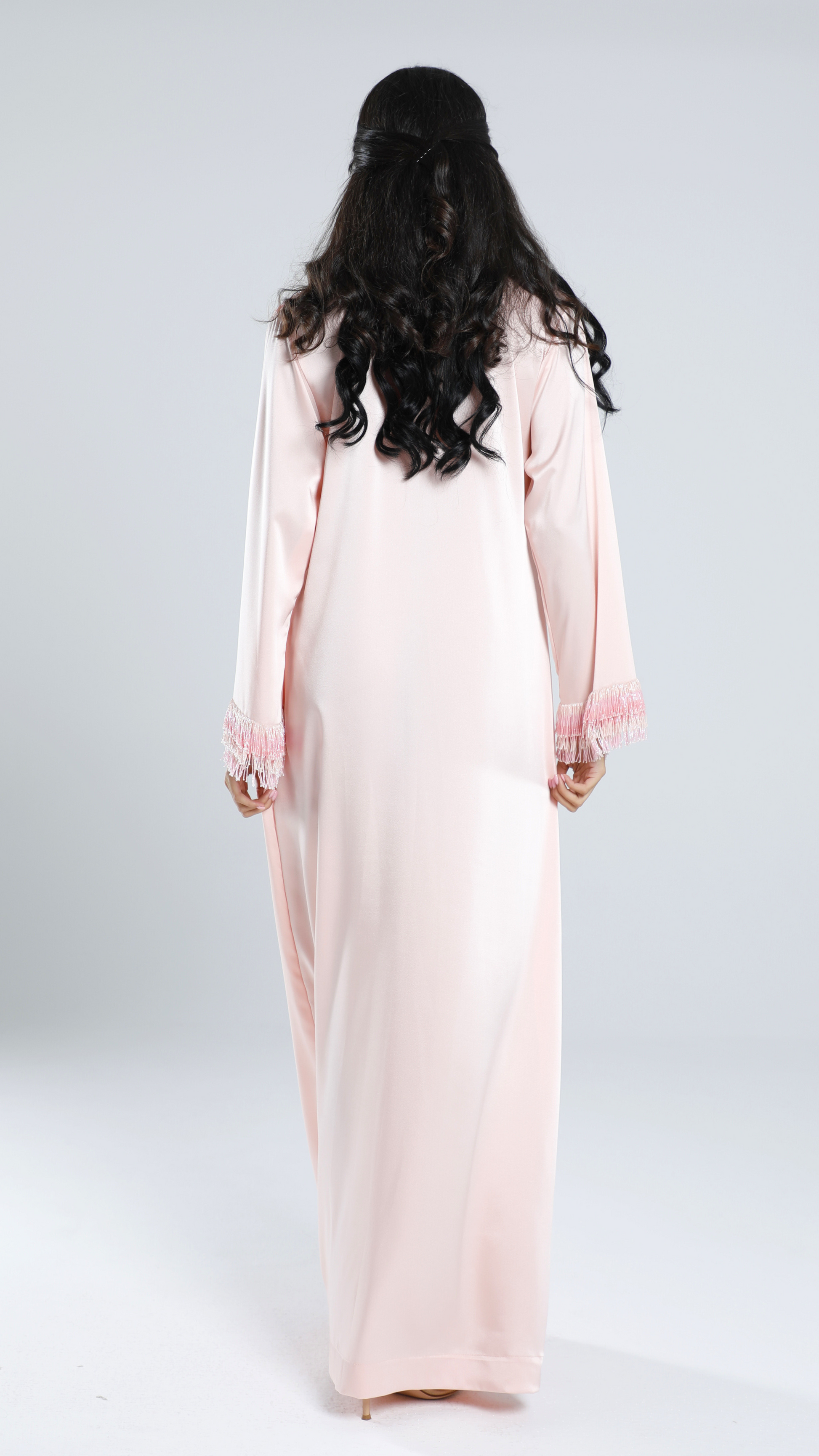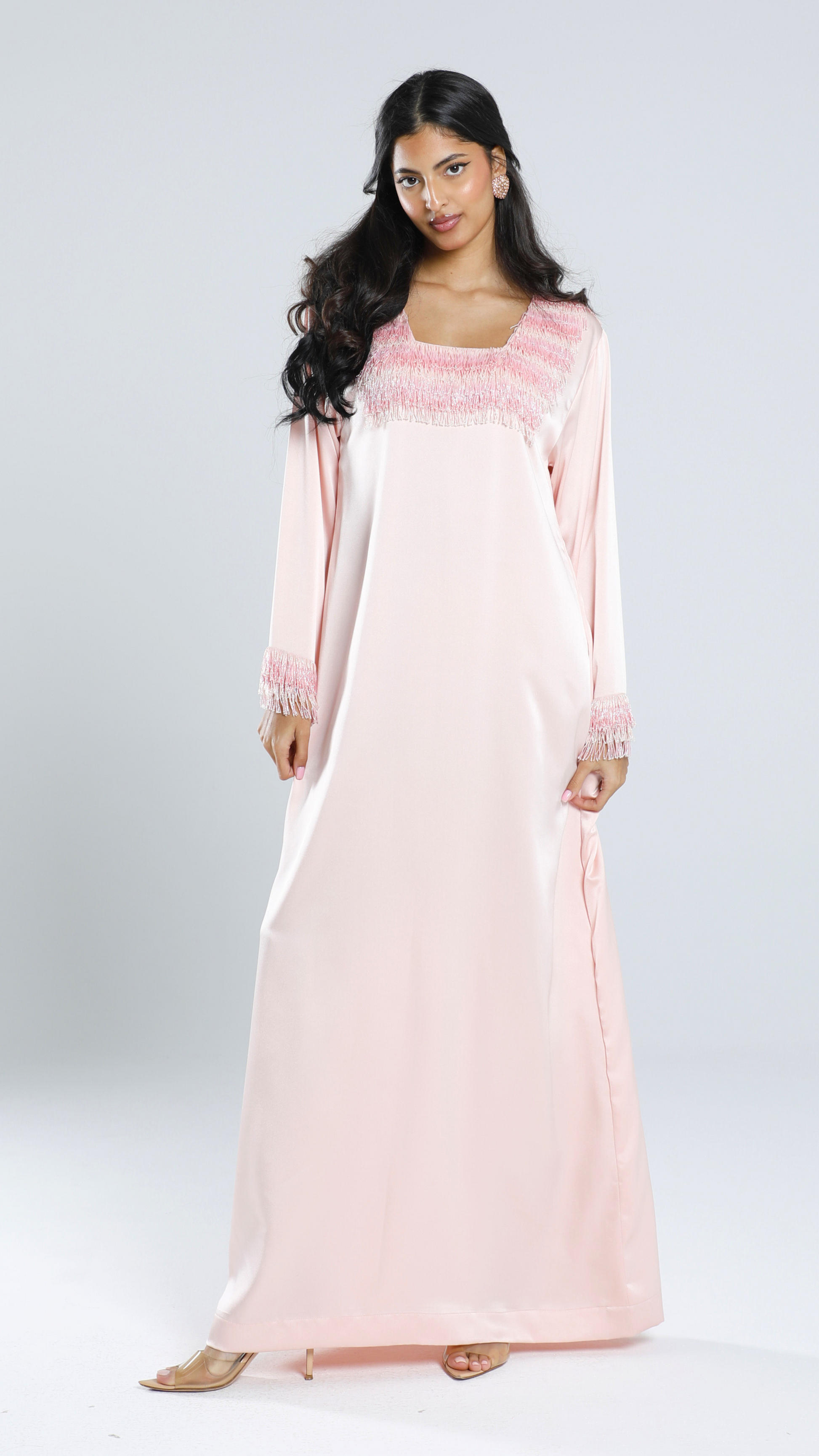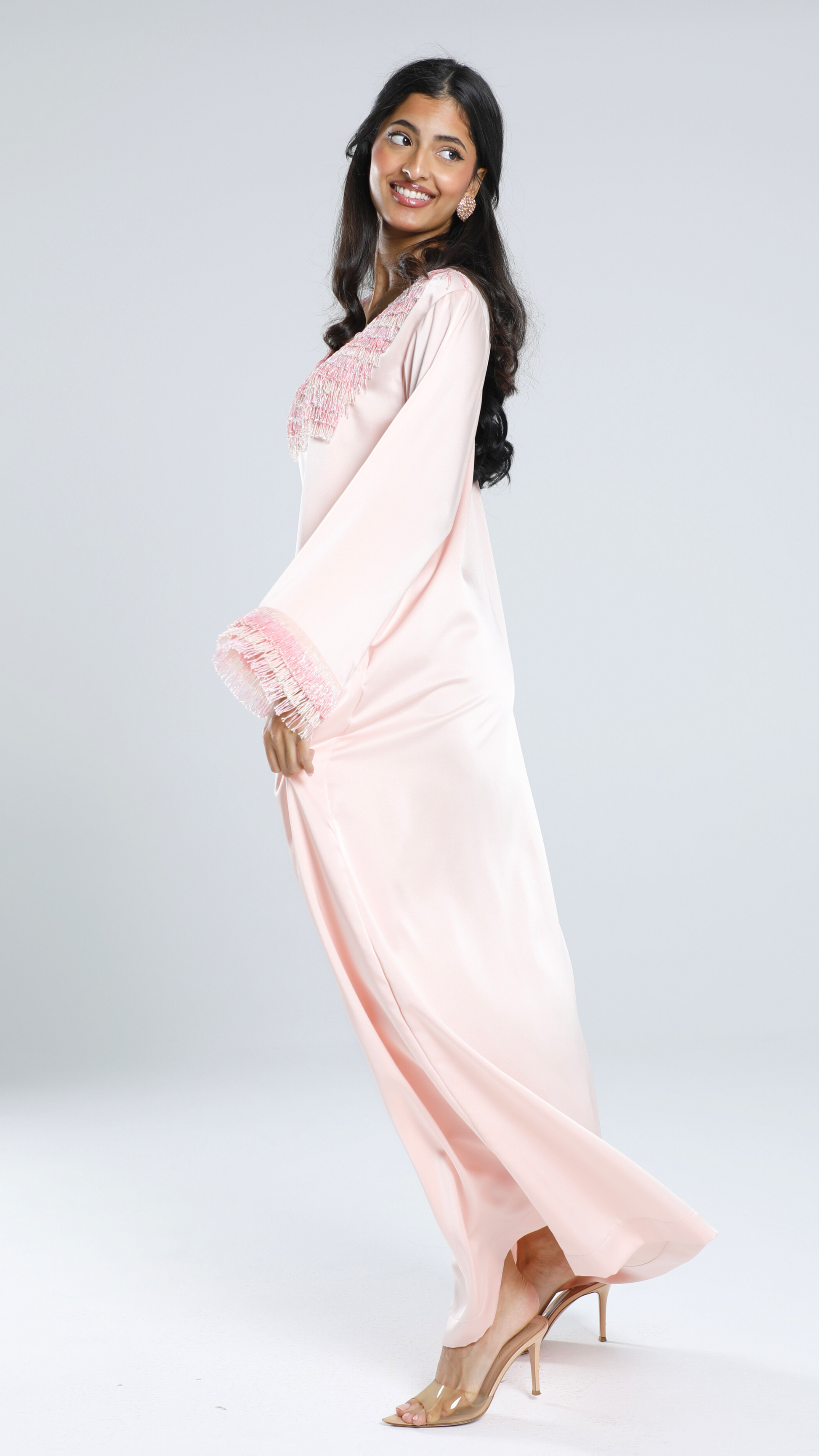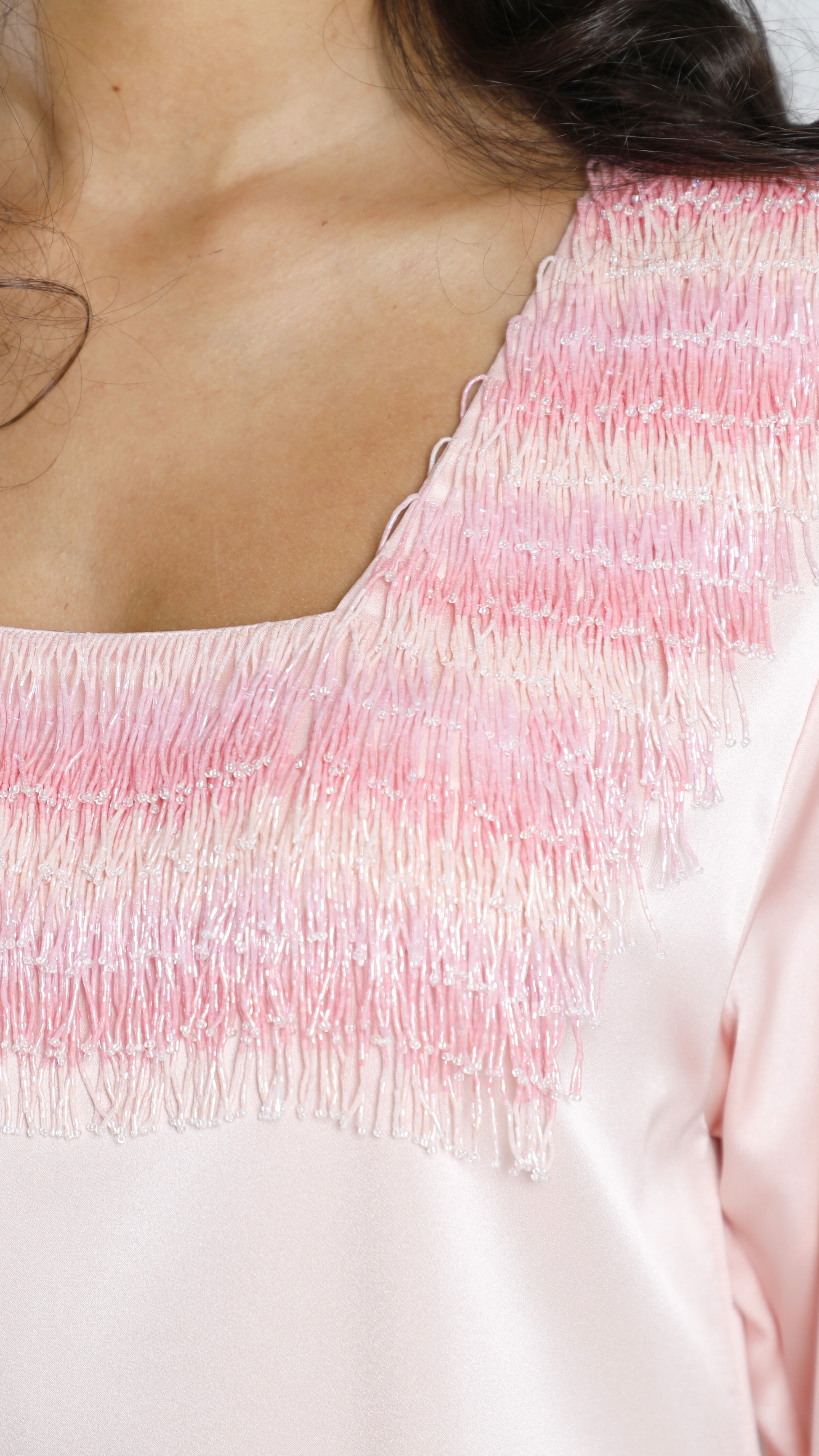 This dress features a neckline adorned with handcrafted ombré tassels, blending art deco elegance with modern flair. The tassels’ color transitions add depth and movement, creating a striking statement piece.